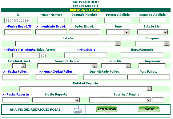 En la ventana se asocia el nmero de la Tarjeta de Identidad de la persona, se oprime el botn ingresar y se muestra la siguiente pantalla: