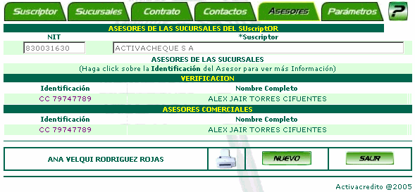 Esta ventana es activa en el quinto Tab de la ventana de suscriptores. Permite registrar el asesor que realizo la afiliacin.